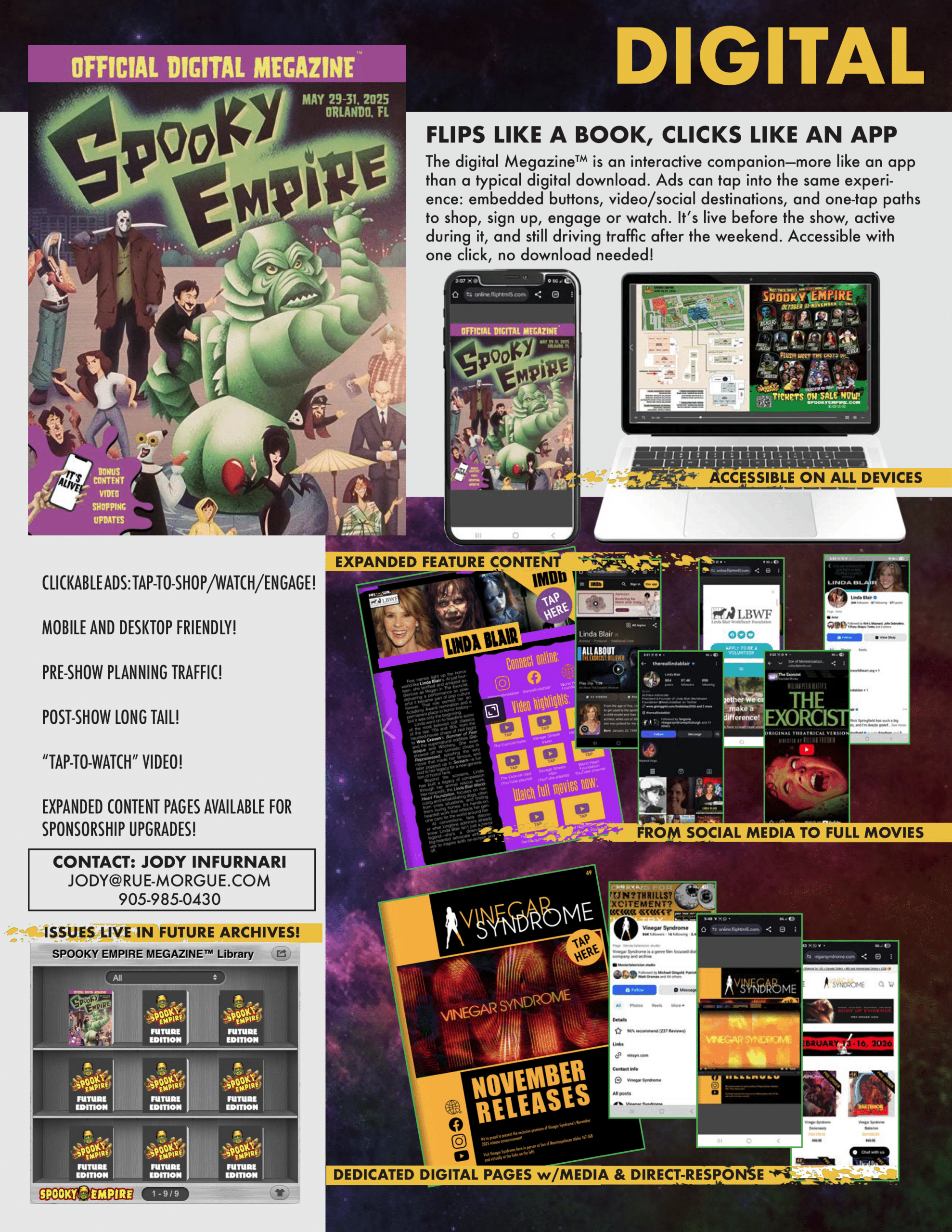 We’re also working withJody Infurnari (Rue Morgue Magazine Co-Owner & Director of Marketing) as Business Development Manager to support sponsors and advertisers and help tailor placements to real goals (booth traffic, launches, preorders, lead capture, etc.).
